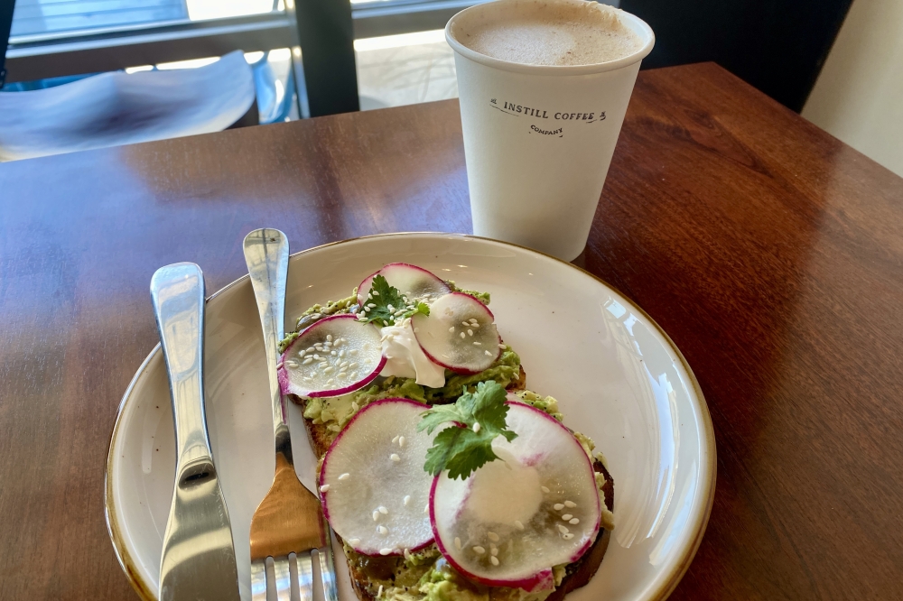 The Instill Coffee Co. menu features a selection of organic coffee, matcha, sweet and savory toasts, and pastries.
