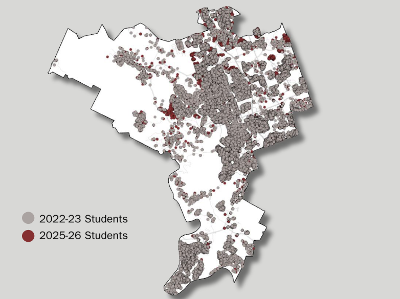 On the current demographic map, students enrolled this school year are shown in red, and students enrolled in 2022-23 are shown in gray. Layering the map this way more clearly points to where new housing construction is, Tepera said.