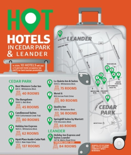 While Leander’s hotel tax revenue stream is just getting started, Cedar Park is in the process of revising its method for allocating hotel tax funds to local entities.