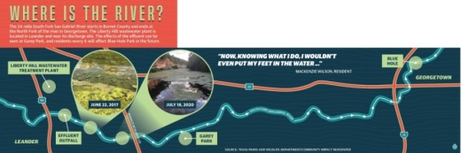 Photos provided to Community Impact Newspaper by residents who live near the river show a stark difference in the quality of the river on the east and west sides of the discharge site.