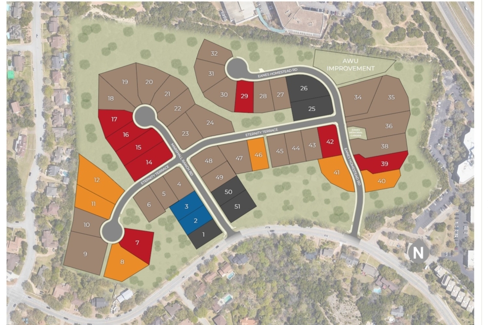 Given the topography, residents can choose a flat lot with a view toward Omni Barton Creek Resort or downtown Austin.