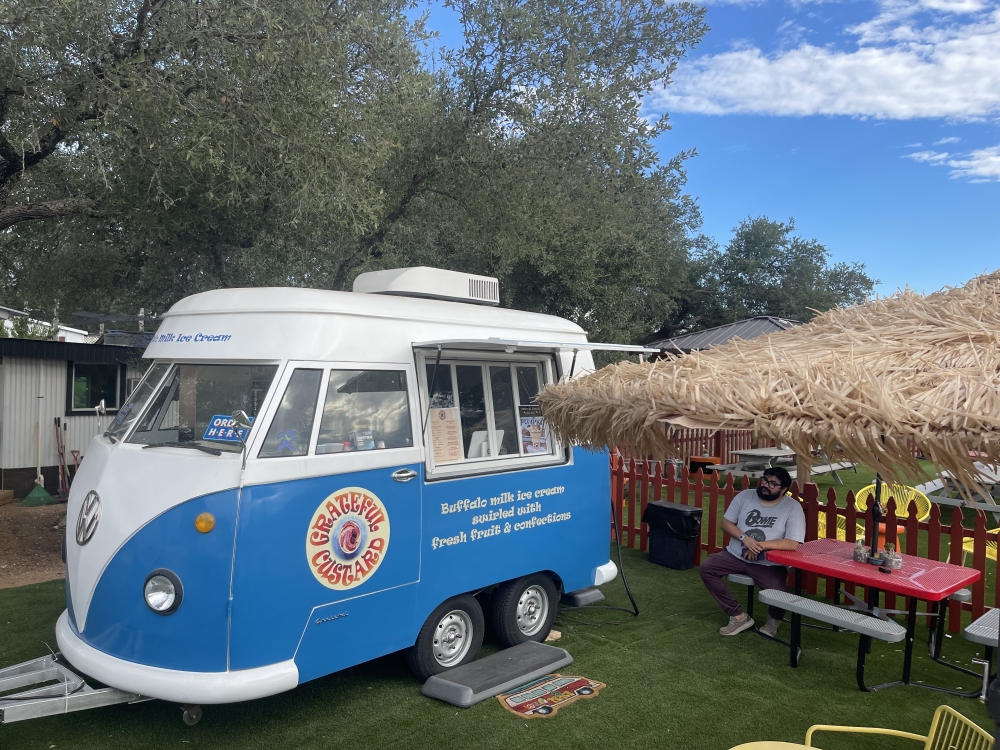The food truck serves ice cream made from Texas-raised and locally pasteurized buffalo milk, swirled with fresh fruit and baked confections.
