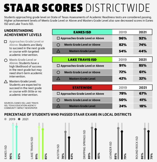 Parents pushing their children to complete schoolwork assisted with the transition process between virtual and in-person learning and allowed the districts to continue showing high performance, said Stefanie Allen, LTISD assistant superintendent for curriculum and instruction. Performance varied by campus, however, with some campuses seeing more substantial drops in passing percentages on the STAAR test than others.