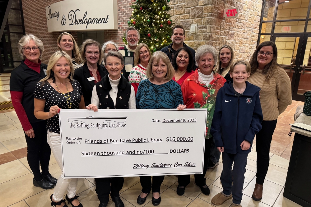 Chambers, a member of the 12 Kings Car Club in Wimberley, presented a check for $16,000 to city officials on Tuesday as the end result of the annual Rolling Sculpture Car Show that takes place in late October at the Hill Country Galleria in Bee Cave.