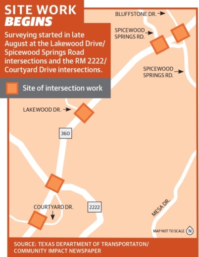 Surveying started in late August at the Lakewood Drive/Spicewood Springs Road intersections and the RM 2222/Courtyard Drive intersections. Work should not affect traffic, although crews will occasionally be using heavy equipment, according to TxDOT.