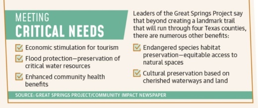 Merritt said the goal is for the GSP to be complete by 2036, and along with local governments, Great Springs Project leaders are working with the real estate community, the National Parks Service, a development company, private land owners and conservation groups to develop a clearer picture of what will eventually become the longest continuous trail in Texas.