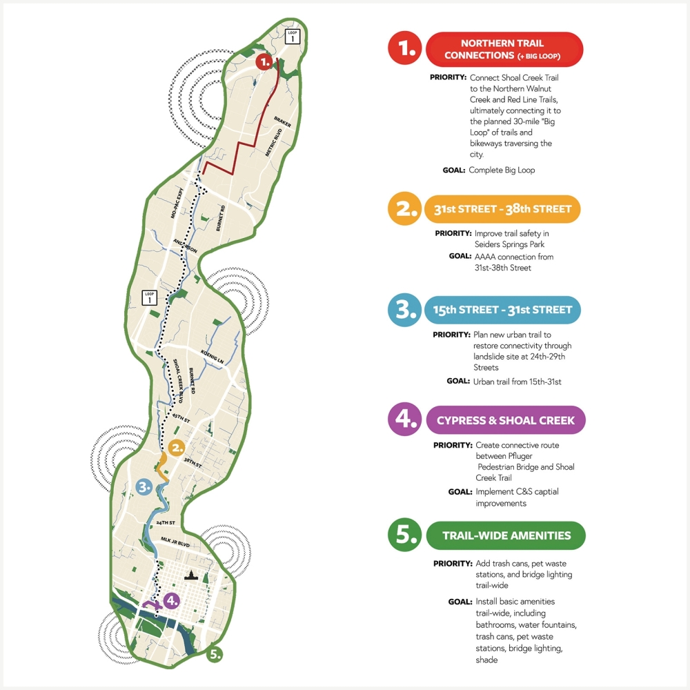 Looking ahead, the Shoal Creek Conservancy is actively working on the following improvements: