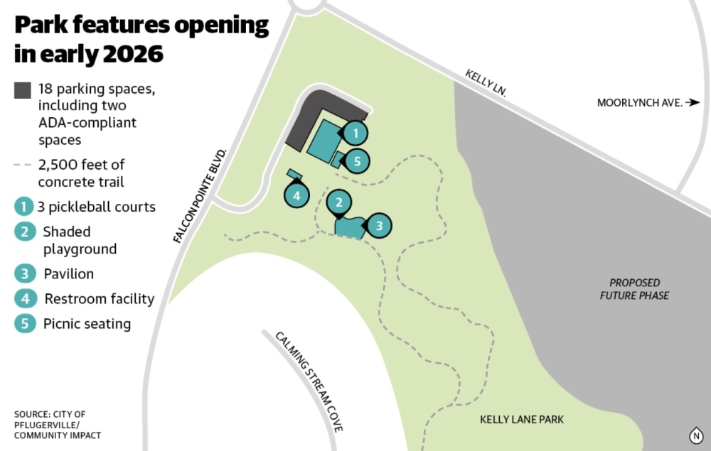 The neighborhood park located at the southeast corner of the intersection of Kelly Lane and Falcon Pointe Boulevard will have pickleball courts, a new playground and trail connections.