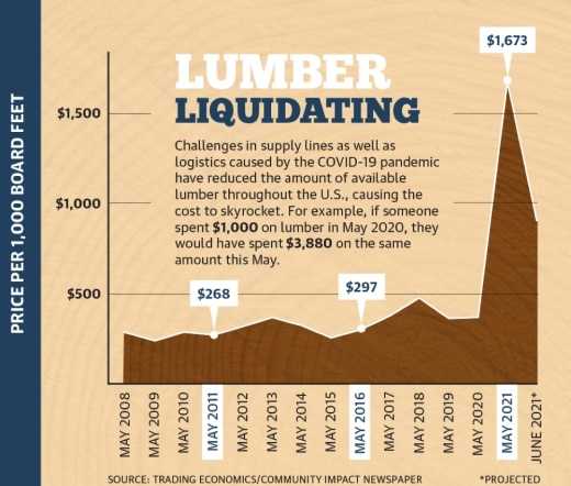 The cost of lumber by board feet, which is 1 square foot and 1 inch thick, has increased by 388% according to Trading Economics, an online economic data platform that provides historical data and forecasts. The cost of 1,000 board feet of lumber increased from $365 in May 2020 to $1,673 this May.