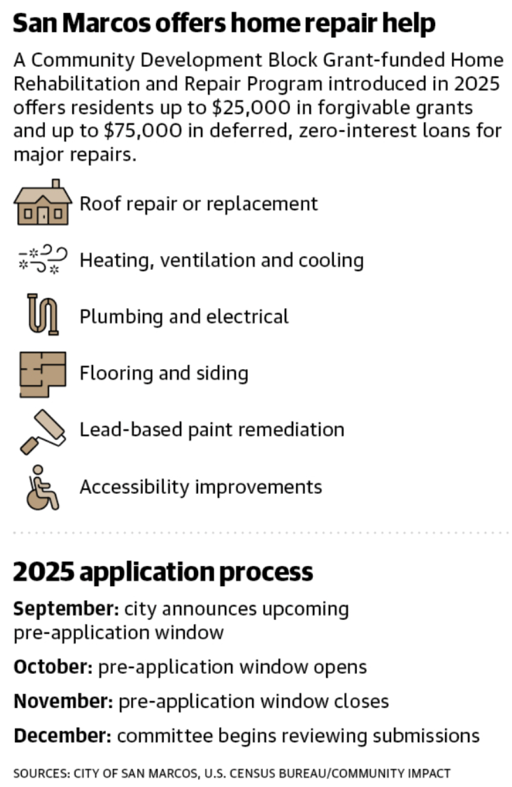 From Oct. 8 to Nov. 17, San Marcos officials opened pre-applications for a new Community Development Block Grant-funded Home Rehabilitation and Repair Program, offering up to $25,000 in forgivable grants and up to $75,000 in deferred, zero-interest loans for major repairs. Planning and Development Services officials said they are prioritizing applications based on whether anyone in the home is an older adult or has a disability.