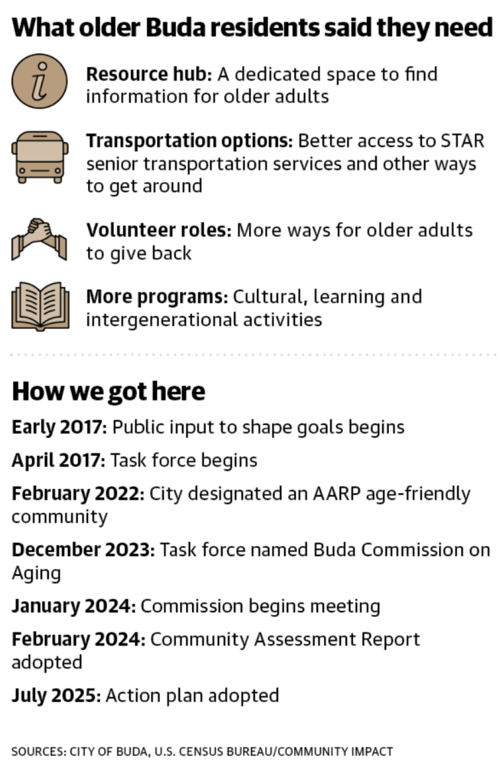 The Buda Commission on Aging also partners with the city to maintain an older-adult resources list to help residents find things to do and resources, such as food assistance, mental health services and more.
