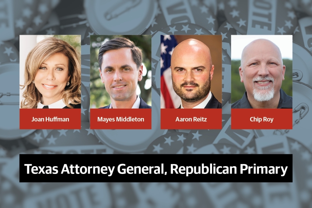 After three terms as Texas' top lawyer, incumbent Ken Paxton is running for the U.S. Senate, leaving his office open. Joan Huffman, Mayes Middleton, Aaron Reitz and Chip Roy are seeking the Republican nomination for attorney general.