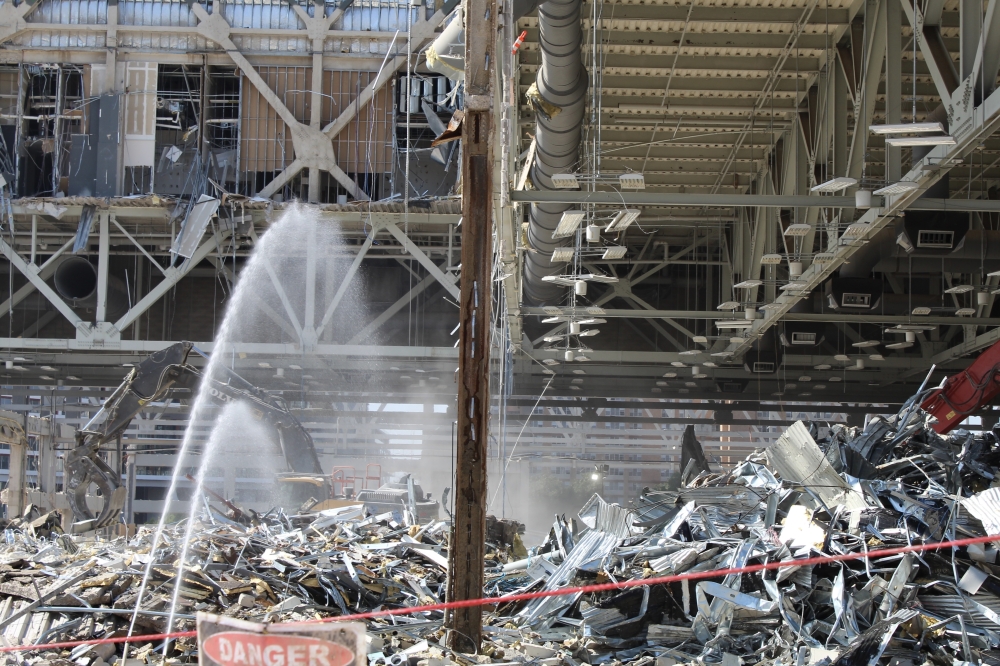 After crews finish tearing down the existing center in late October, they will begin excavating the site, digging 55 feet into the ground before placing foundations for the new building early next year.Work on the construction site, which takes up six city blocks, can be disruptive to nearby businesses. Sprinklers are placed throughout the site to prevent the spread of dust.