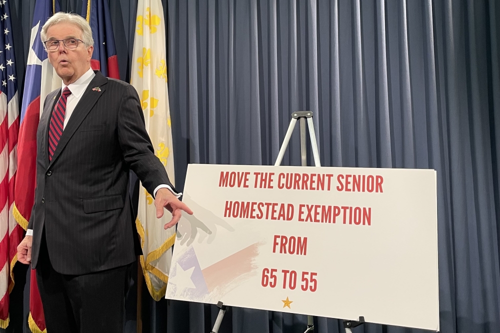 Under Patrick's proposal, younger homeowners would see a $180,000 exemption, while Texans age 55 and older would shave $240,000 off the value that can be taxed by local school districts. Homeowners who are at least 55 years old would see about $900-$1,000 in annual savings under the plan, Patrick said, although this estimate does not account for potential tax rate increases by local governments.