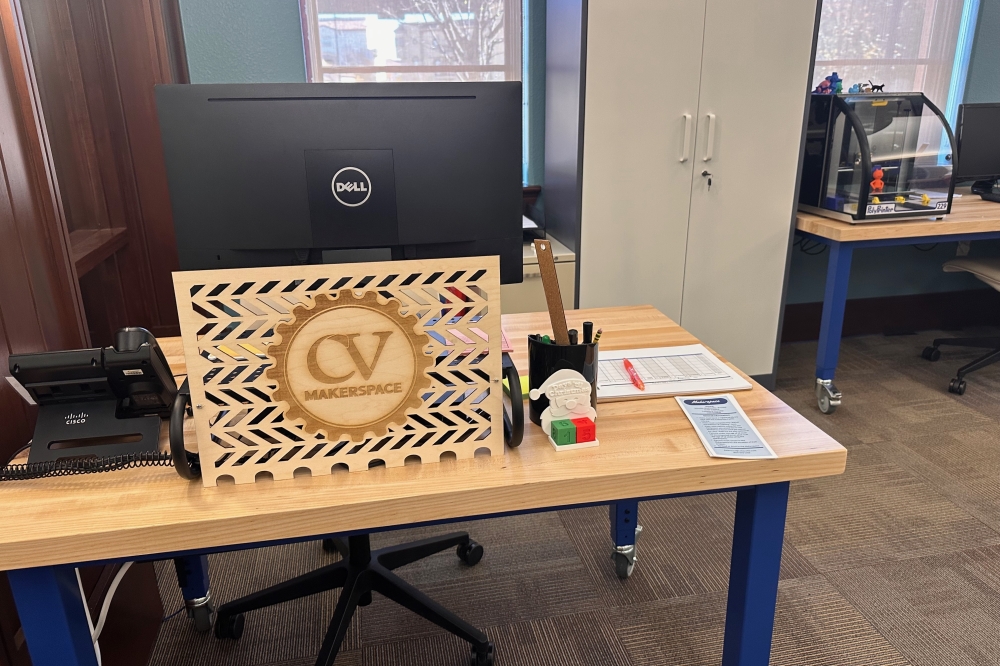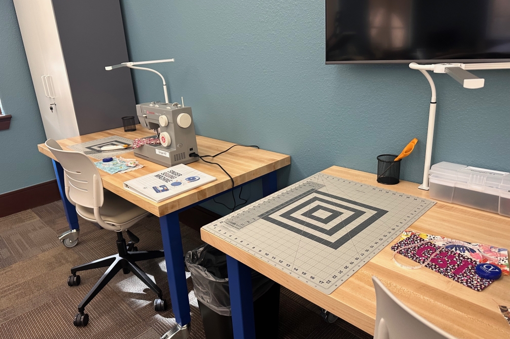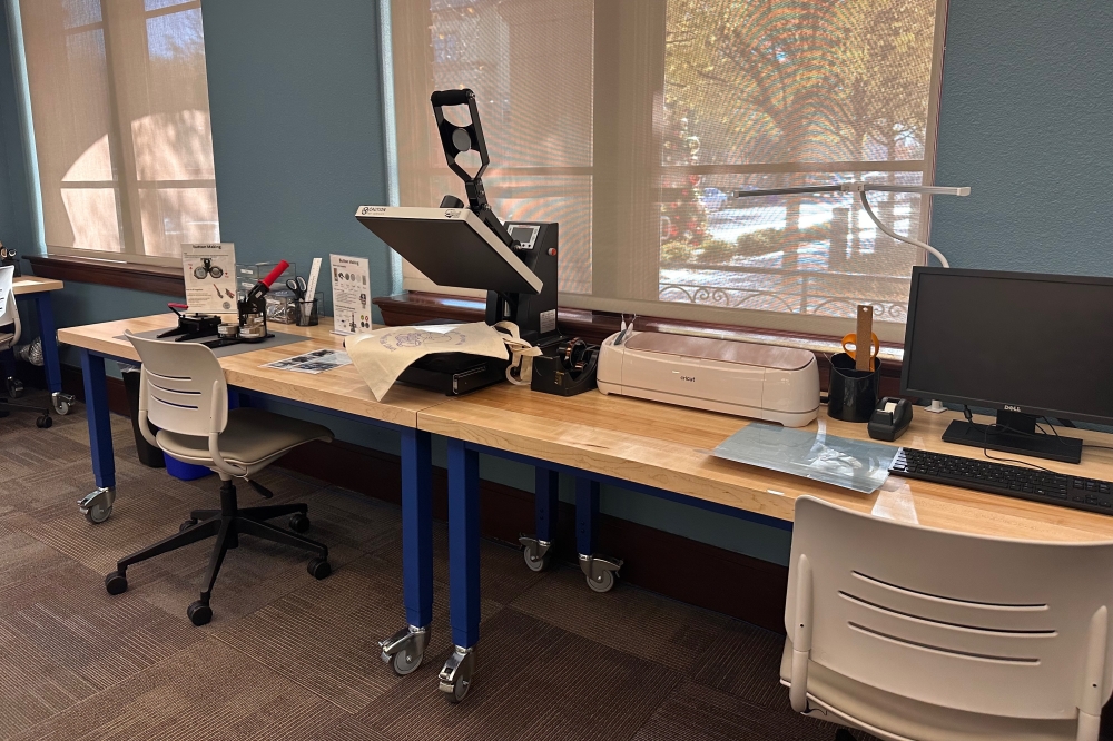 Equipment includes 3D printing, a laminator, laser engraving, sewing machines, button makers, and a Cricut and heat press, according to the library's website.