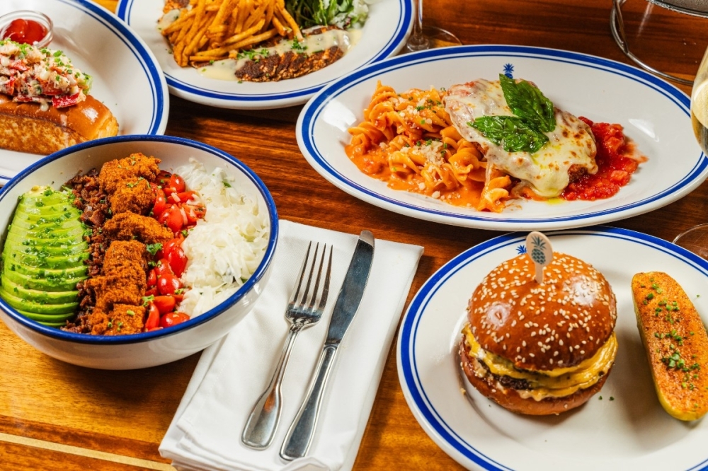 Options on the menu include avocado dip with ranch chips; cheeseburgers with American cheese, pickles and house-made Hudson sauce; chicken parm with parmesan reggiano; and the American Tuna Tower, with ahi tuna, avocado, cucumber and wasabi vinaigrette.
