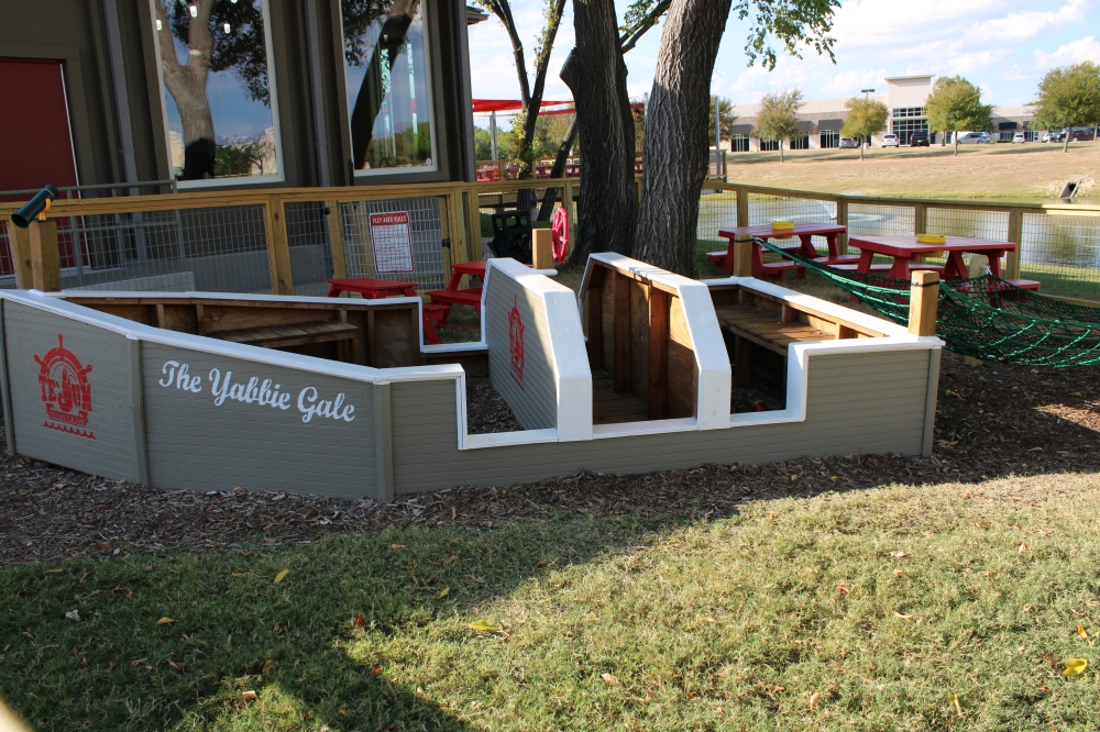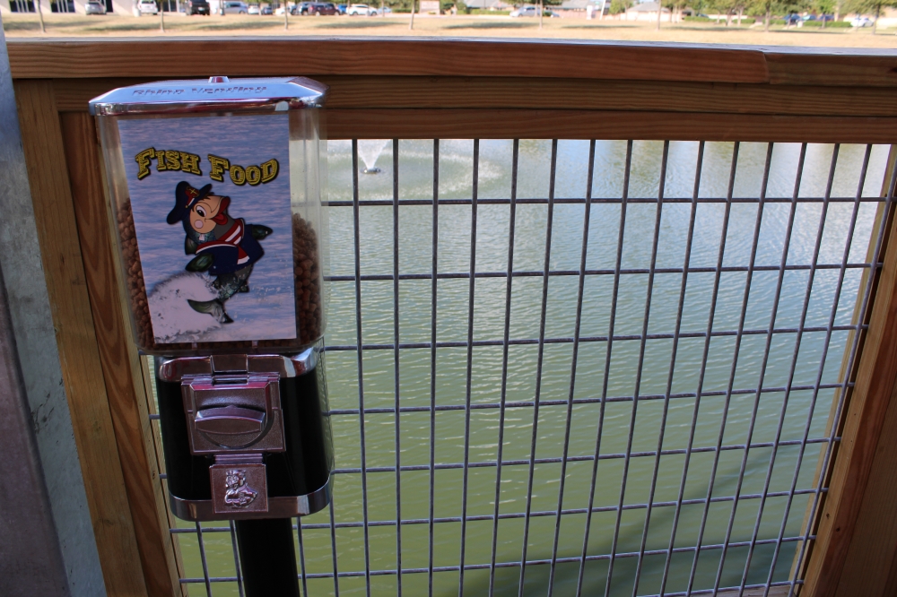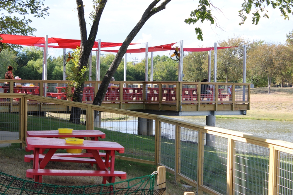 The restaurant is located near the Bourland Road pond and has a pier with a children's outdoor play area where people can feed the fish.