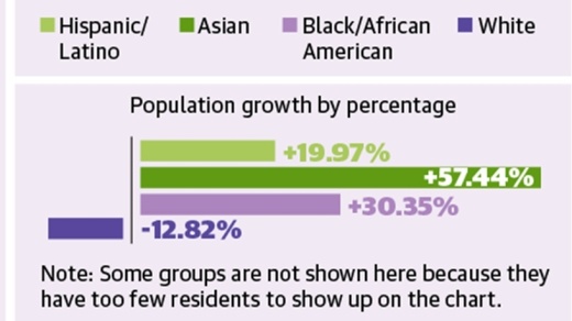 In terms of race and ethnicity, the highest growth in both number and percentage occurred within the city’s Asian community. Between 2010 and 2020, the number of residents in this group grew by over 57%, from 43,659 to 68,738, according to the census.