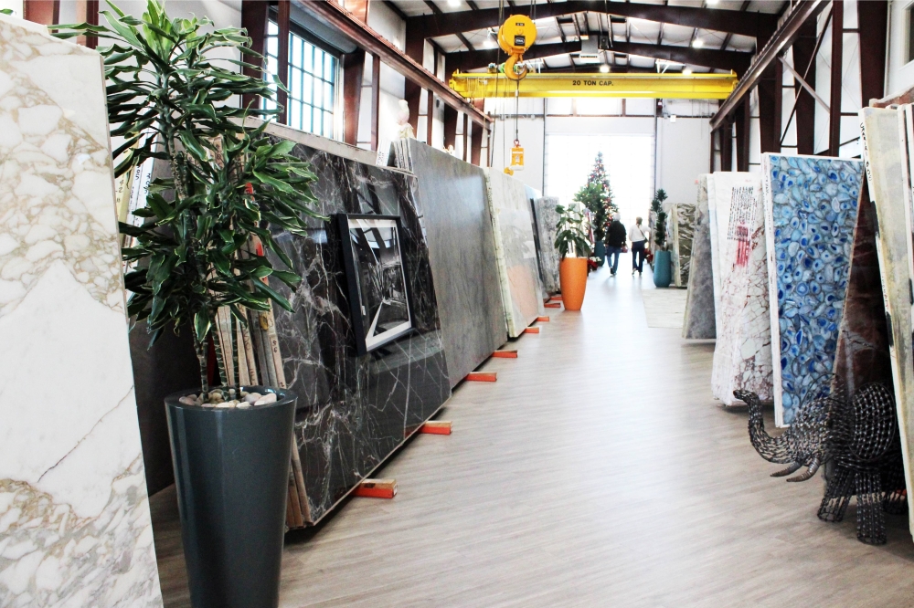 Sandwiched between two indoor showrooms is an outside showroom. Each area features a variety of stone slabs sourced from around the world including Italy, Brazil, Turkey, Cambodia and more.