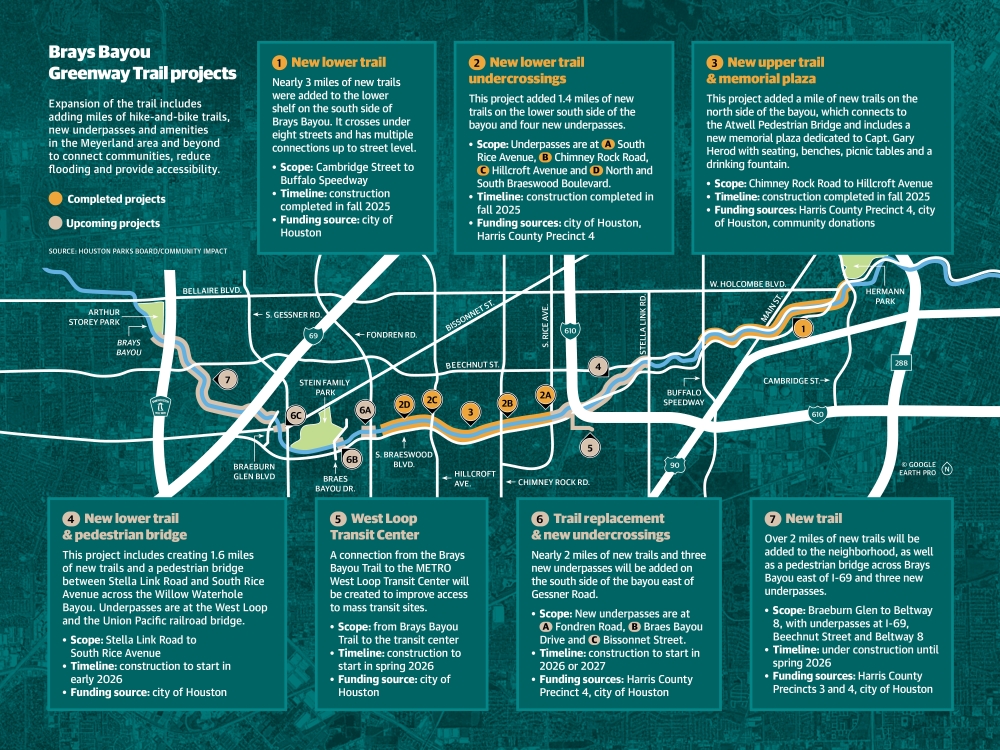 “That’s seven streets that people don’t have to worry about crossing,” he said. “And it actually ties in really well with other projects that we’re doing downstream towards the [Texas] Med Center to create even more trails and underpasses.”