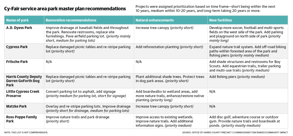 The Precinct 3 Parks and Trails Master Plan debuted in 2023 and divided the north Houston area into four service areas: Cypress, Spring, Humble and Crosby. Officials with Commissioner Tom Ramsey’s office said park improvements were needed because population in the area, which spans over 555 square miles, is expected to double by 2045. The population growth will also increase demand for recreational facilities, trails and green space access, officials said.