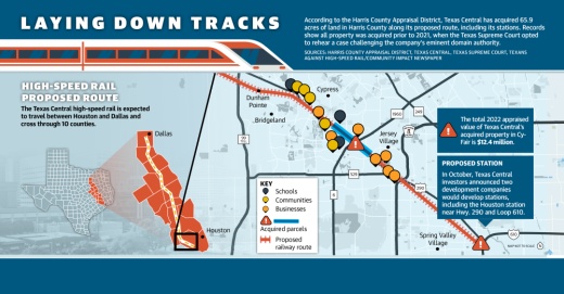 The future 43-acre mixed-use Village Center development in Jersey Village also lies within the route. Mayor Bobby Warren said at a February town hall meeting the train is being considered throughout the development of the property off Jones Road and Hwy. 290, but with the Texas Supreme Court decision up in the air and state legislators expressing their intent to file bills to protect rural landowners, Warren said he was uncertain of the train’s future.