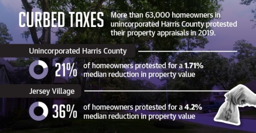 For example, 36% of Jersey Village homeowners protested their appraisals in 2019 for an average of 4.2% savings. In the Willowbrook area, 12% of homeowners protested, and they ended up saving about 1.67% on their values in the same year, according to data from January Advisors.