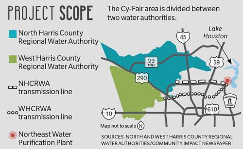 Bringing surface water to Cy-Fair involves several steps. The $361 million Luce Bayou Project will allow officials to pump up to 450 million gallons of water per day from the Trinity River to Lake Houston, where it will be treated at the Northeast Water Purification Plant, Rendl said.
