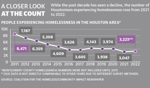 The organization reported in a March 16 report that there were more than 3,200 homeless people in the Greater Houston area. The number of homeless persons increased by 5.8% from 2021 to 2022, according to the report. However, the region had about 4,000 people experiencing homelessness at the start of the pandemic in 2020.