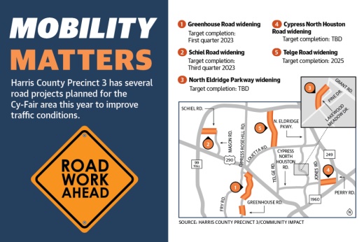 Several other Cy-Fair projects are slated to break ground this year, including a $7.5 million project to widen the two-lane asphalt Cypress North Houston Road to a four-lane concrete boulevard from Perry Road to Jones Road.