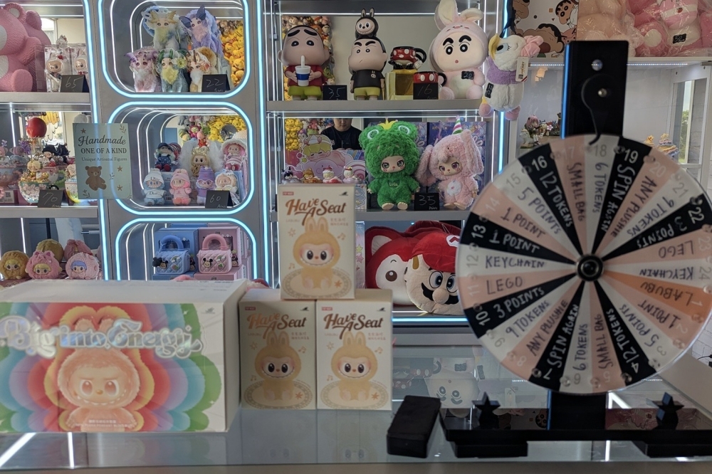 The brightly decorated arcade is filled with unique claw machines and features prizes such as high-quality plushies and Labubus.