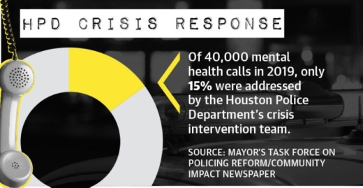 Of the 40,000 mental health-related calls made to the Houston Police Department in 2019, just 15% were addressed by the HPD Crisis Intervention Response Team, which deploys mental health professionals alongside police officers, department data shows. “The system is overburdened, and we have a shortage of mental health care providers,” said Renae Vania Tomczak, CEO of Mental Health America of Greater Houston. “There are ways to mitigate that, but as with everything, it comes down to the funding.”