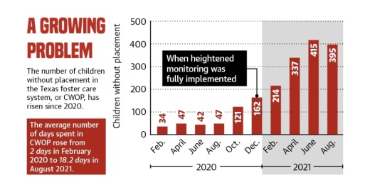 Over the last two years, the state has increasingly relied on unlicensed placements—often motels or office buildings—overseen by caseworkers. In October 2019, 32 children were in such placements statewide, according to DFPS data. By August 2021, the most recent data available, that number had risen to 395 children.