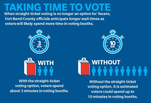 The average Fort Bend County voter spends one to three minutes at a voting machine with a straight-ticket voting option, George said. He anticipates voters will spend anywhere from seven to 10 minutes at the machines without this option.