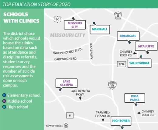 The eight clinics are located at Hightower High School, Marshall High School, Willowridge High School, Lake Olympia Middle School, Christa McAuliffe Middle School, Missouri City Middle School, Rosa Parks Elementary School and Briargate Elementary School. They are open to anyone in the district, regardless of whether they work at or attend that specific school.