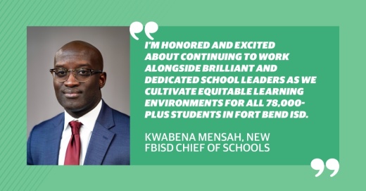 “Dr. Mensah has done a tremendous job dutifully serving our district for several years,” FBISD Superintendent Christie Whitbeck said in the announcement. “When it came time to select the best candidate, the most qualified person was right down the hall. I am confident he will continue to do great work in support of the children and staff of Fort Bend ISD.”