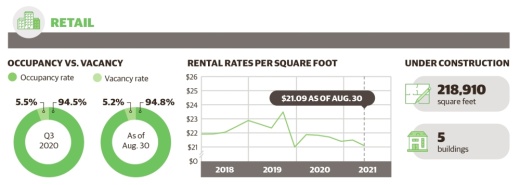 At the end of August, office vacancies dropped below 16% in The Woodlands area to 15.9%. A total of 660,000 square feet of office space is under construction in The Woodlands area. Industrial occupancy rates remained at 92.9%, the same as the previous month, while retail inched up 0.2% to 94.8%.