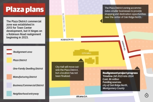 The Plaza District commercial zone was established in 2013 for Town Center development, but it hinges on a Robinson Road realignment beginning in 2023.The Plaza District zoning accommodates smaller businesses to provide shopping and destination opportunities near the center of Oak Ridge North.
