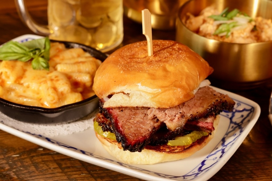 The restaurant features a fusion of Texas BBQ with the flavors of Thai cuisine, complete with a large tap wall. Menu items include Tex-Thai BBQ Fried Rice, Chinese broccoli with pork belly and Charm Special Red Curry Brisket.