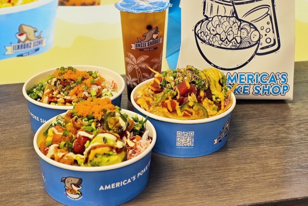 According to information from the company, it offers poke bowls featuring choices such as tuna, salmon, shrimp and chicken as well as tofu. Rice bowls, boba milk tea and soft serve ice cream are also served at Uncle Sharkii's locations.