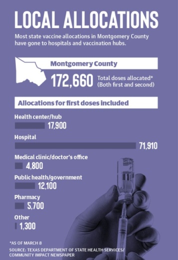 As of early March, the county had received around 172,000 doses from the state, and 46,673 area residents were fully vaccinated, according to information from the Texas Department of State Health Services. However, the county anticipates receiving enough doses to begin vaccinating around 6,000 area residents per day starting in March, said Jason Millsaps, executive director of the Montgomery County Office of Homeland Security and Emergency Management.