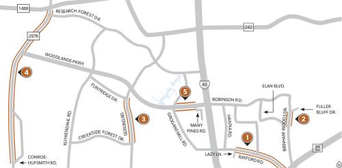 5. Woodlands Parkway widening Montgomery County Precinct 3 officials announced July 2 that the Woodlands Parkway widening was complete and new westbound lanes were open. The project widened the road from six to eight lanes from just west of I-45 to a half-mile west of Grogans Mill Road. It also added one thru lane in each direction and a right turn lane in each direction at intersections along that stretch, Precinct 3 officials said. Timeline: February 2018-July 2019 Cost: $6.8 million Funding source: Montgomery County Precinct 3