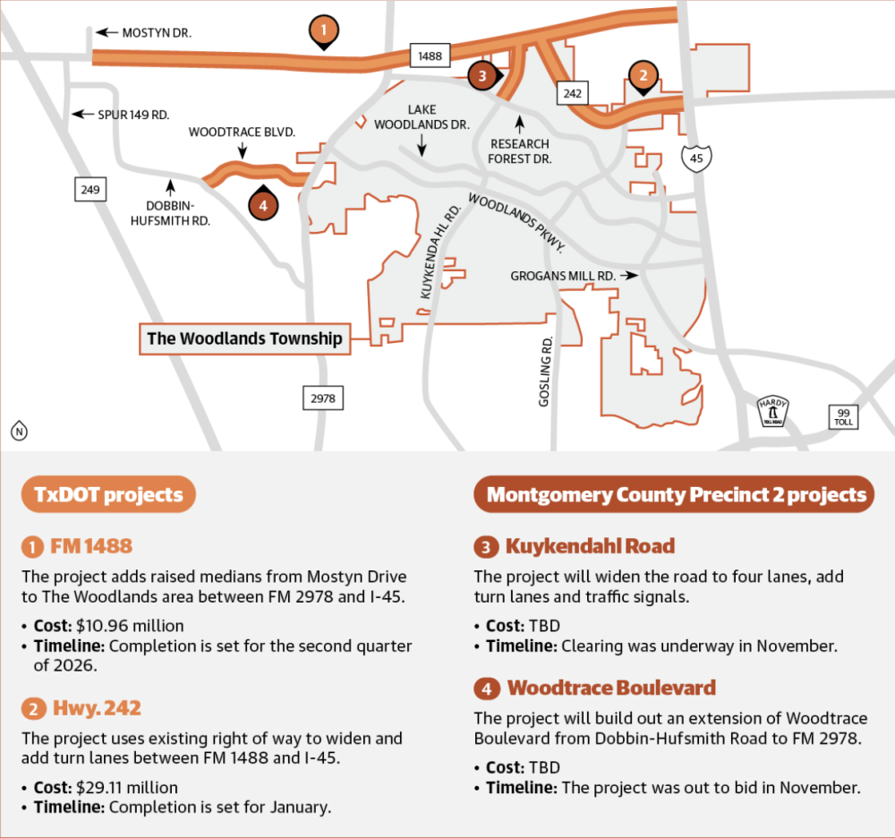 In addition, county projects further west in Precinct 2 also funded by the 2025 May road bond are slated to take shape in 2026 to keep traffic circulating the borders of The Woodlands area near FM 2978 and a portion of Kuykendahl Road.