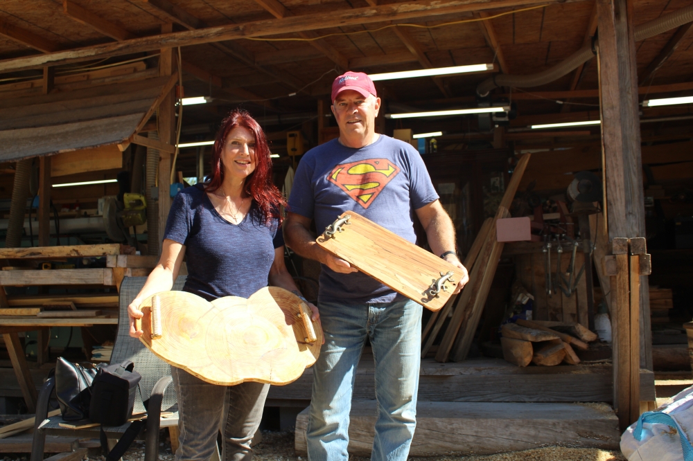 Joey and Sandra Jamison hold a couple of their creations at the Chosen Farm and Sawmill. (Jovanna Aguilar/Community Impact)