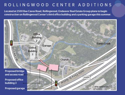 Endeavor is due to approach council March 21 to ask for approval of the site plan and a zoning change. The plan focuses on the east side of the property and includes a five-story office building, a bridge over Eanes Creek and a four-story parking garage with close to 500 parking spots.