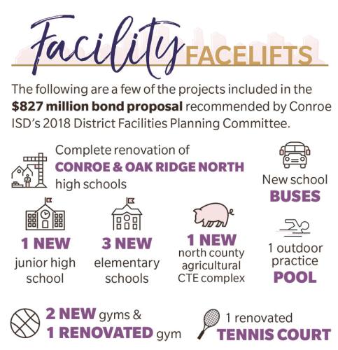 The proposed bond includes funding to complete the renovation of Conroe High School, which began with the passage of the 2015 bond; a complete overhaul of Oak Ridge High School; and the construction of three new elementary schools and one new junior high school, among other projects.