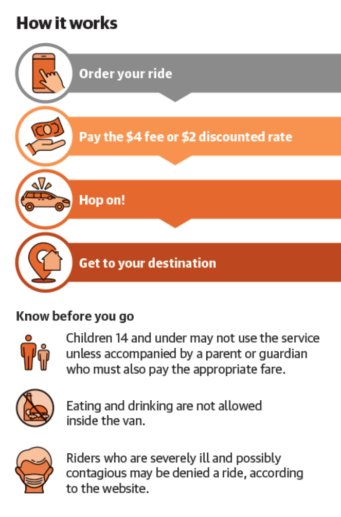 Once selected, riders who are students, veterans, seniors, or disabled can schedule a ride, while others can choose to be picked up as soon as possible, which the city aims to keep within 30 minutes, Sitton said. Seniors, disabled individuals, veterans and students will pay a discounted $2 rate, and other riders will be charged $4, according to the city’s website. Those who do not wish to use the app can either order their ride online at https://city.ridewithvia.com/new-braunfels or call the general dispatch number at 830-282-3413, according to the website.