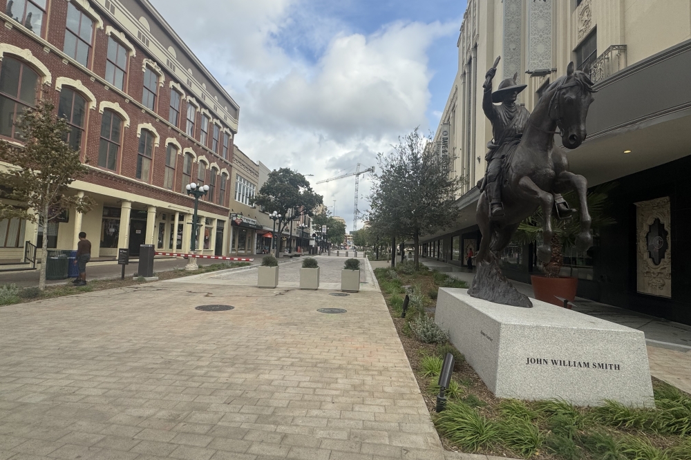 The promenade features statues of historical figures from the Texas Revolution, including Sam Houston, Juan Seguin, Jose Antonio Navarro and John William Smith, the Alamo courier. The promenade also features cobblestones detailing Texan history from early human settlement to statehood.