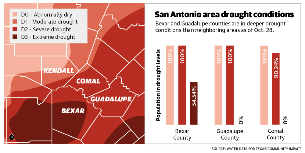 According to the Keetch-Byram Drought Index, an index of soil moisture that determines hydrological drought, Guadalupe County is at 610 out of 800 as of Nov. 3, with 800 representing completely dry conditions. Bexar County is at a similarly dry 583 out of 800. Both counties are also classified as being in a majority severe agricultural drought by the U.S. Drought Monitor.