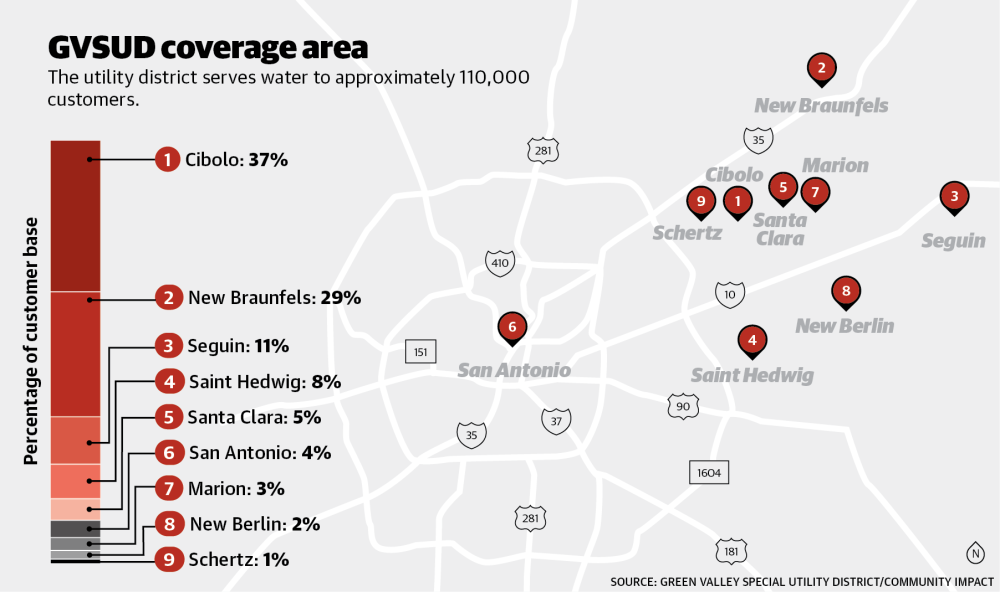 The highest percentage of GVSUD customers is in the city of Cibolo. In November, customers who receive their sewer bill from the city and their water bill from GVSUD will receive a single bill combining both entities.
